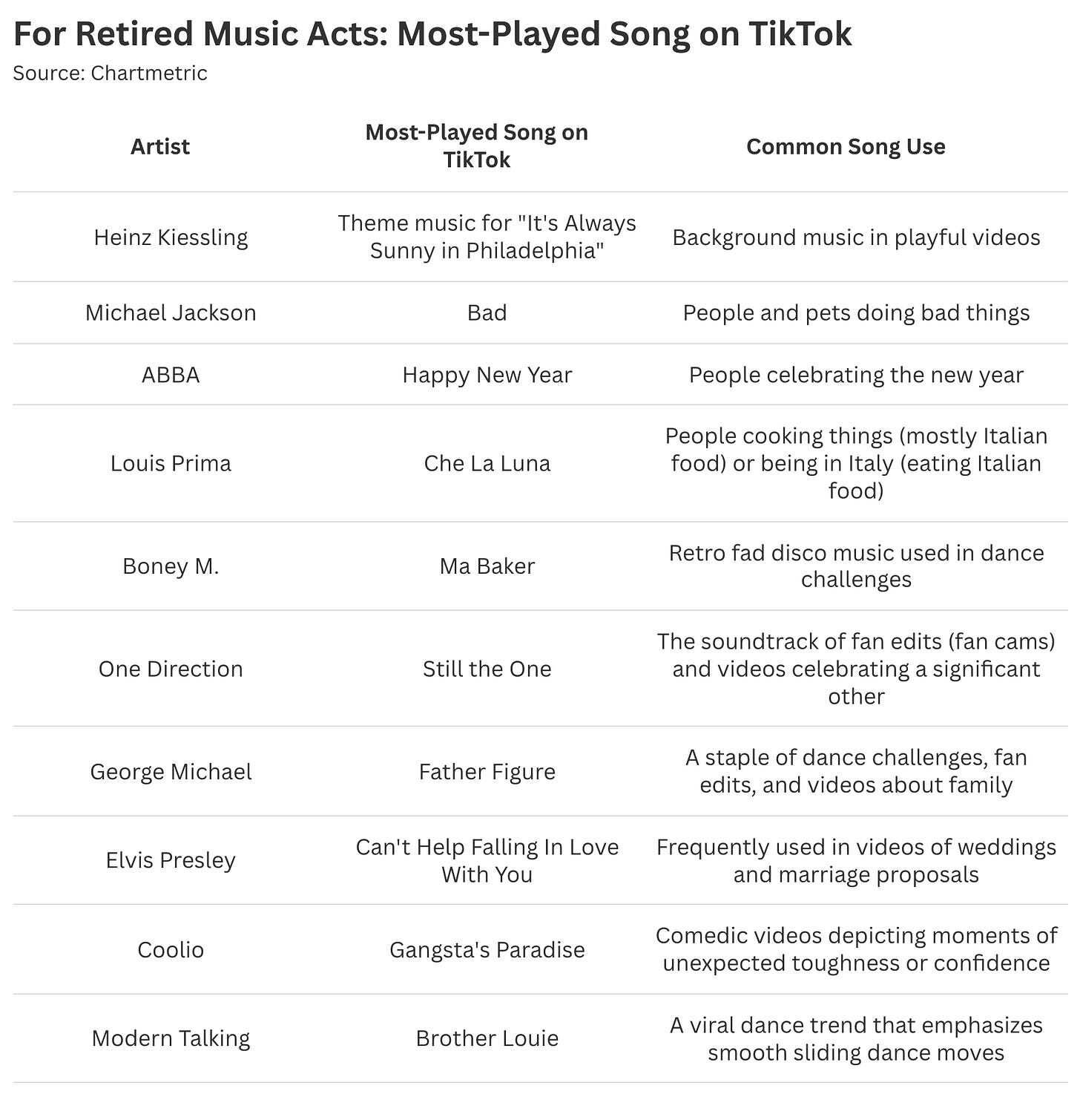 And yet I remain skeptical: if TikTok were music's ultimate tastemaker, it would have the power to bestow virality upon overlooked classics and emerging artists alike, rather than just amplifying the momentum of up-and-coming songs. This raises an intriguing thought experiment: which long-dormant artists have been embraced by TikTok, and do these musicians benefit from repeat use on social media?