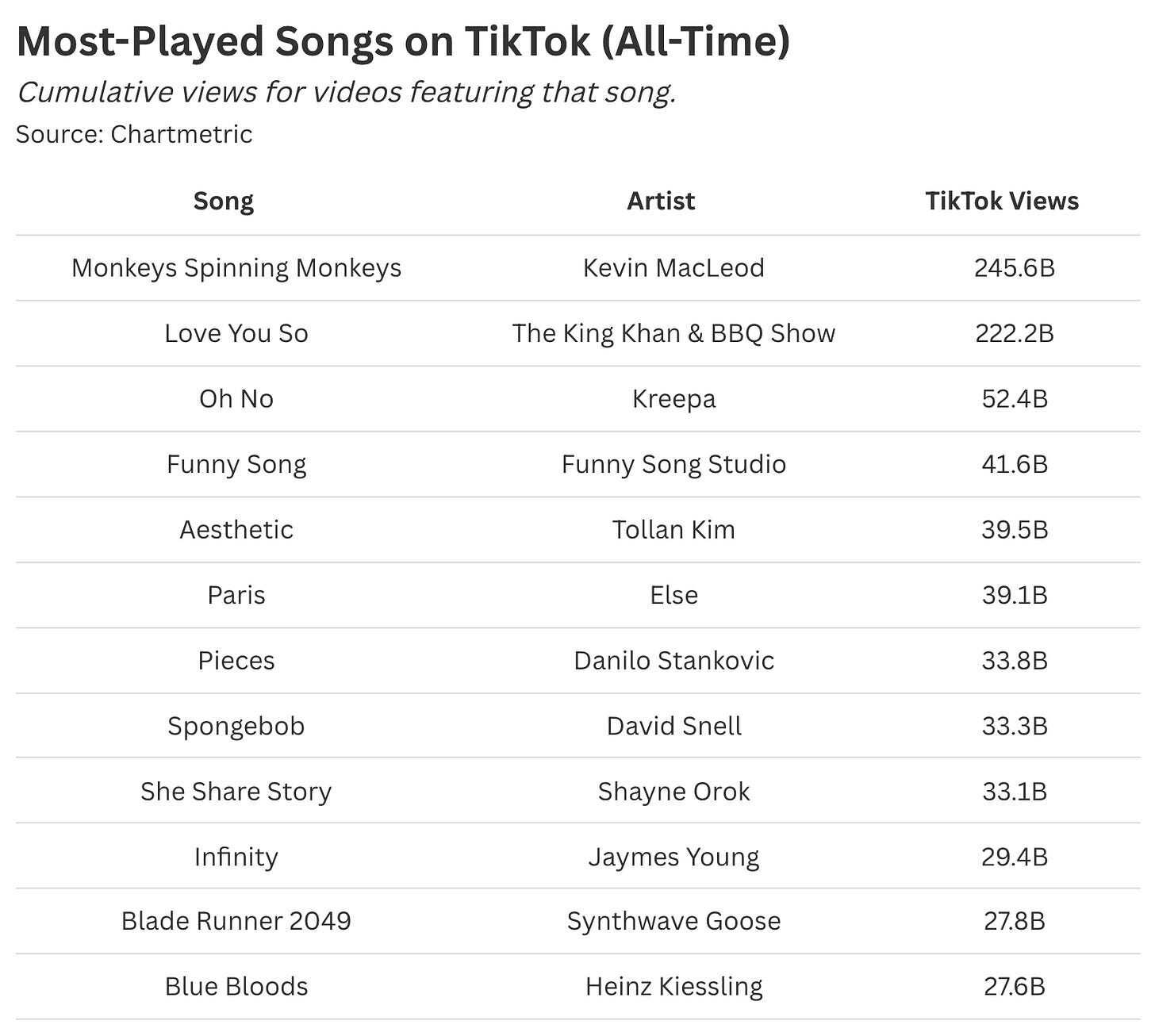 This phenomenon extends to the platform's most-played tracks of all time. Analyzing the songs with the highest cumulative views on TikTok reveals an unmistakable contradiction: collectively, these tracks have amassed nearly 800 billion views, yet you've likely never heard of them.