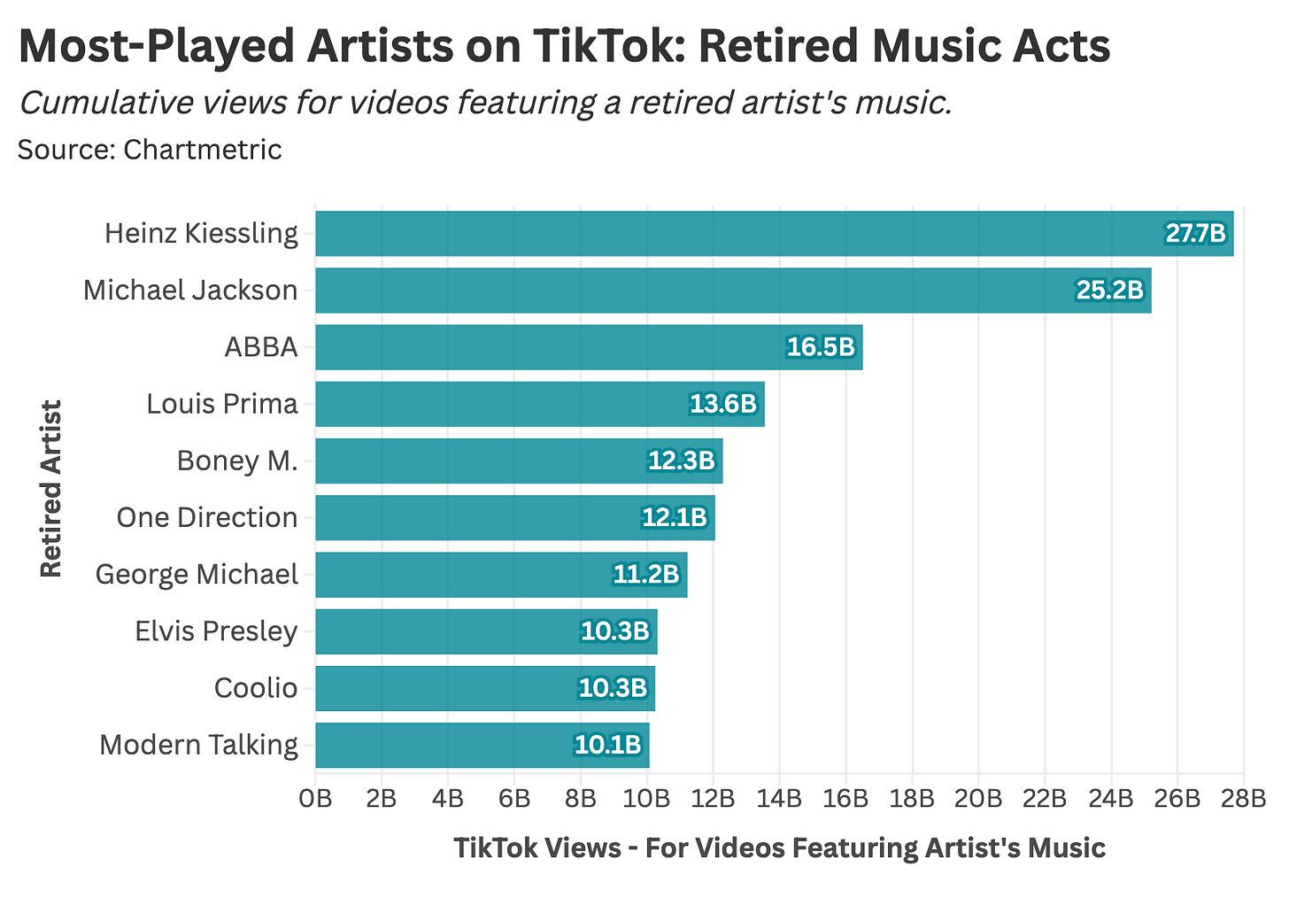 In fact, our list of retired musicians frequently sampled on TikTok is a bizarre hodgepodge of all-time greats—ABBA, Michael Jackson, and Elvis—and acts obscure to contemporary audiences—such as Louis Prima, the aforementioned Heinz Kiessling, and Modern Talking.