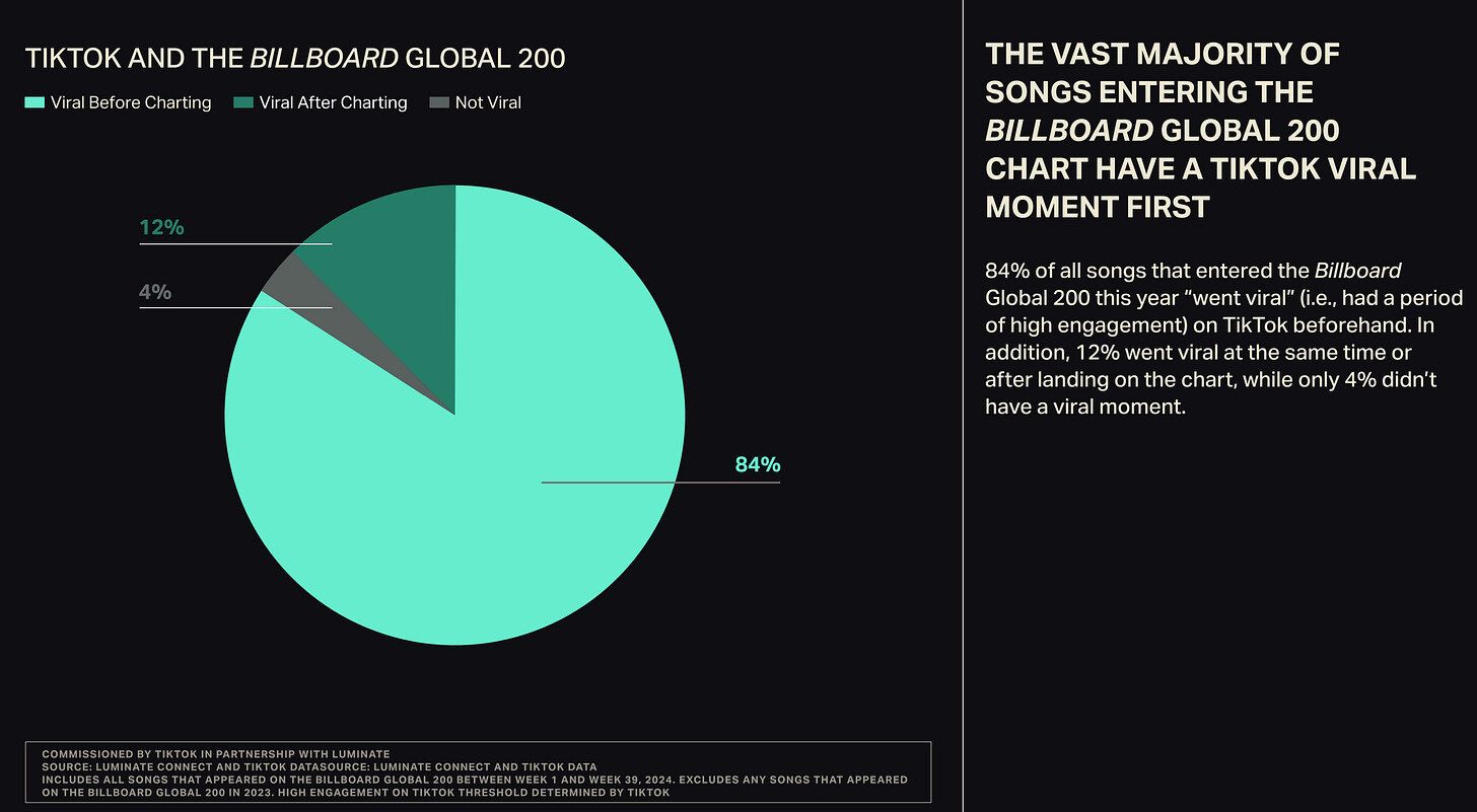 According to TikTok's totally-not-biased research team, 84% of songs on the year-end Billboard Top 200 went viral on the platform before reaching the Top 200 charts, which you can see detailed in this aesthetically unpleasant pie chart: