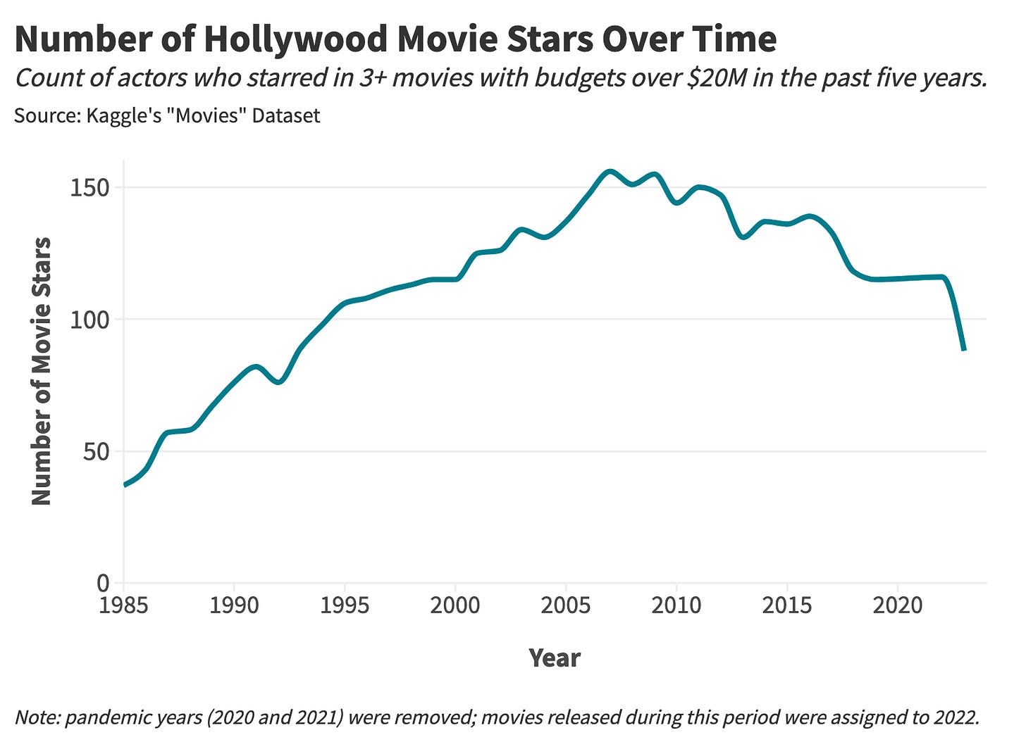 To do this, we’ll impose a stricter definition of movie stardom. An actor or actress will qualify as a “star” if they have held a leading role in at least three films within a five-year window, where each film carries an inflation-adjusted production budget of $20 million or more.