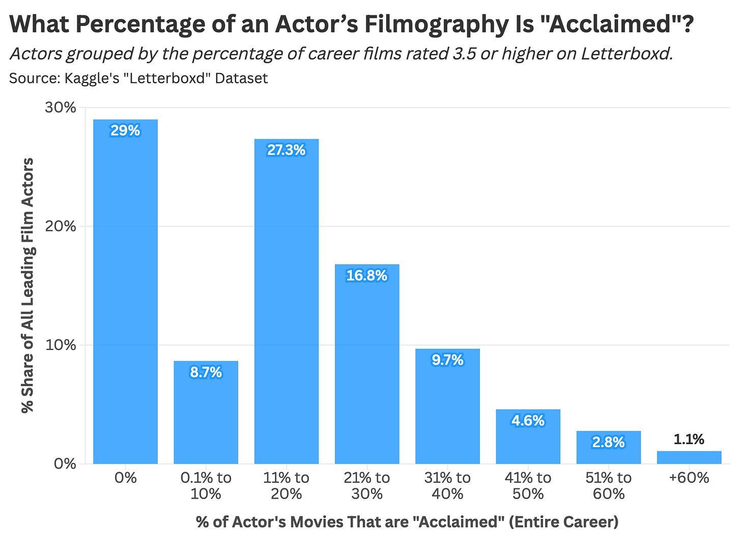 As you might expect, the numbers are not encouraging. To assess quality, we’ll calculate a performer’s career-long “hit rate,” defined as the share of their filmography with a Letterboxd score of 3.5 or higher (out of 5 stars). For example, an actor with five “acclaimed” films across ten leading roles would have a 50% hit rate.