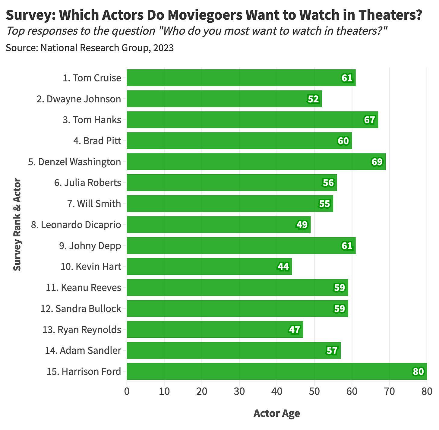 In late 2023, a survey conducted by the National Research Group asked consumers, “Which actor do you most want to see in theaters?” The results were remarkable: not a single actor in the top 15 was under 44. Unsurprisingly, these findings threw the entertainment industry into a (minor) existential crisis.