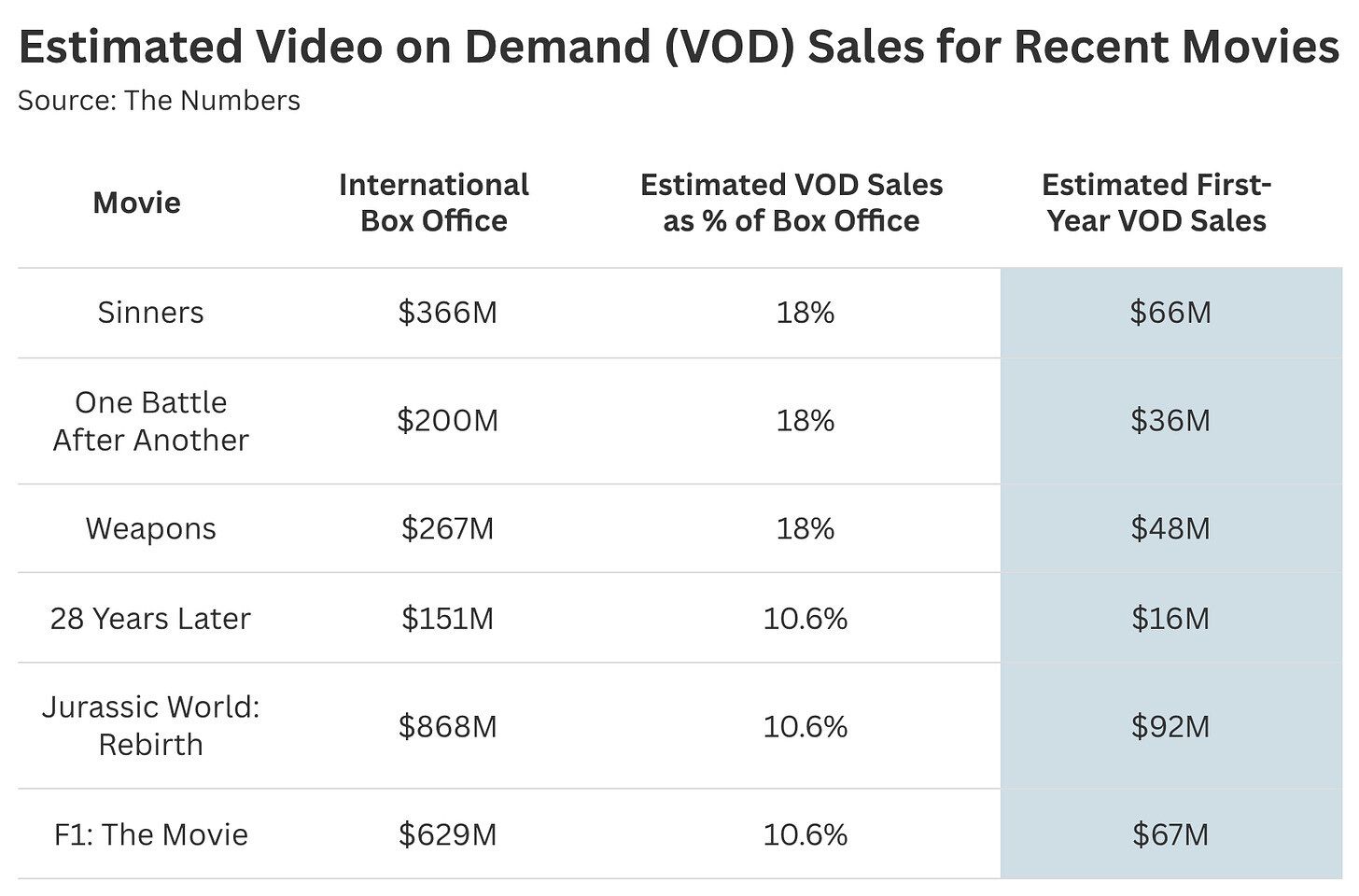 So what do these figures look like when applied to recent releases? Assuming strong buzz, a film like Sinners could see $66M in first-year VOD sales, while One Battle After Another might generate $36M in first-year rentals.