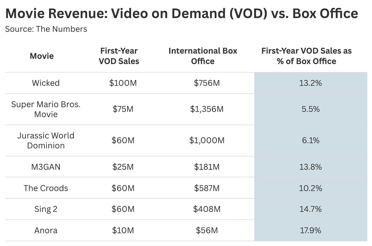 Based on the first-year VOD earnings of Wicked, Anora, M3GAN, and a handful of other titles, it appears films typically see rental sales that equal 10% to 20% of worldwide box office.