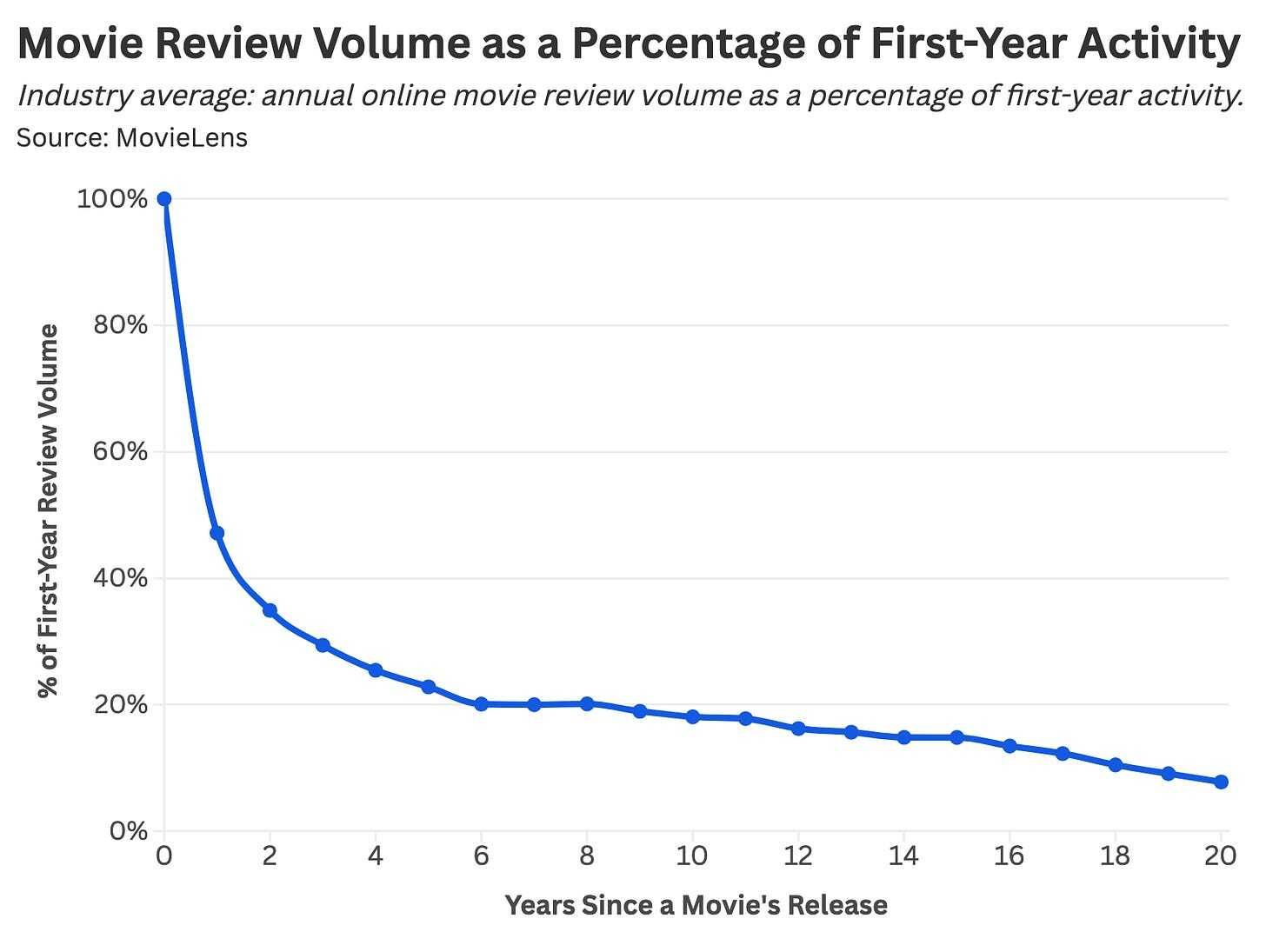 User-generated data from the review site MovieLens shows that most films slowly fade from the cultural conversation, eventually settling into a steady, long-tail pattern of viewership relative to their initial peak.