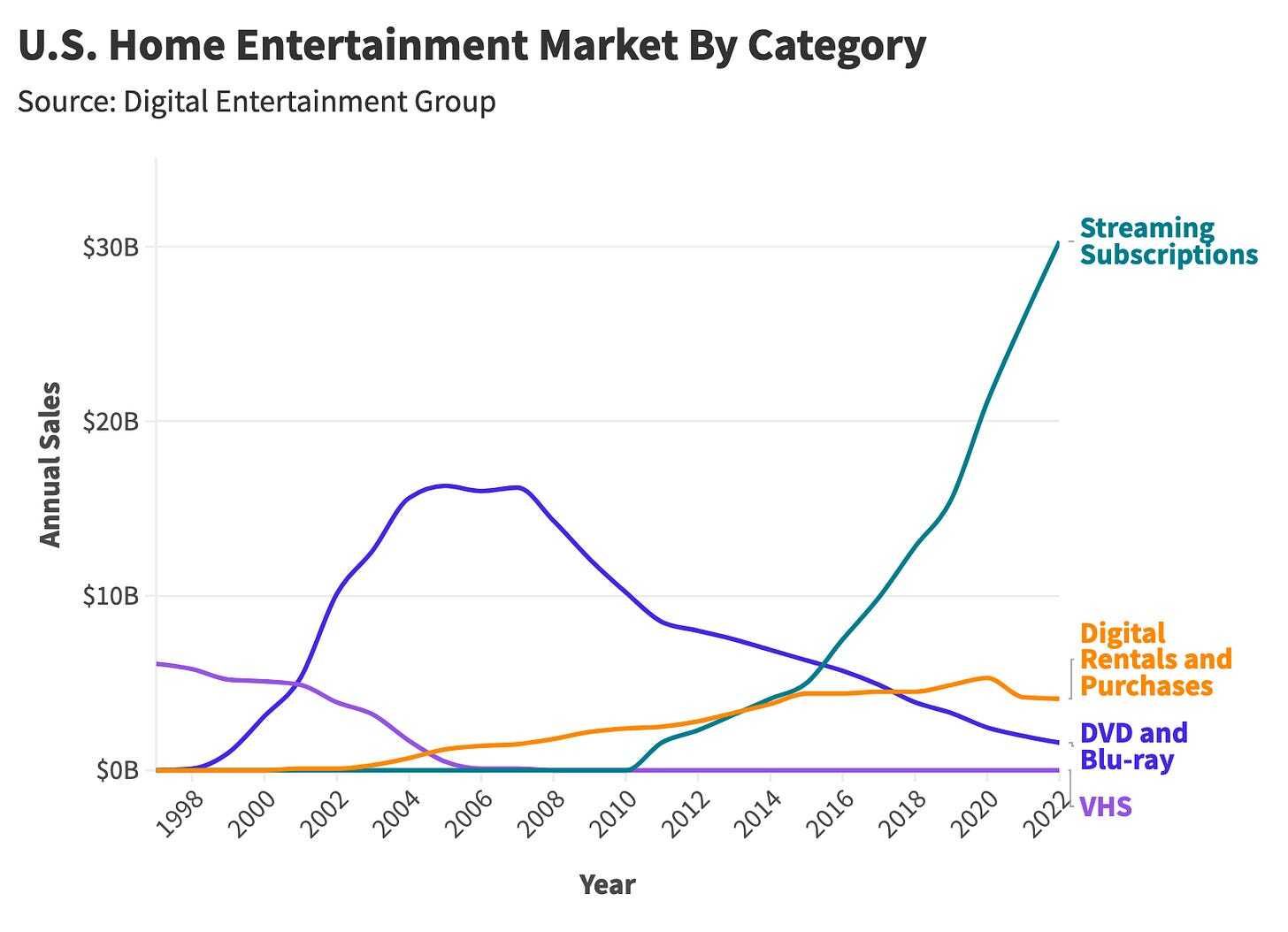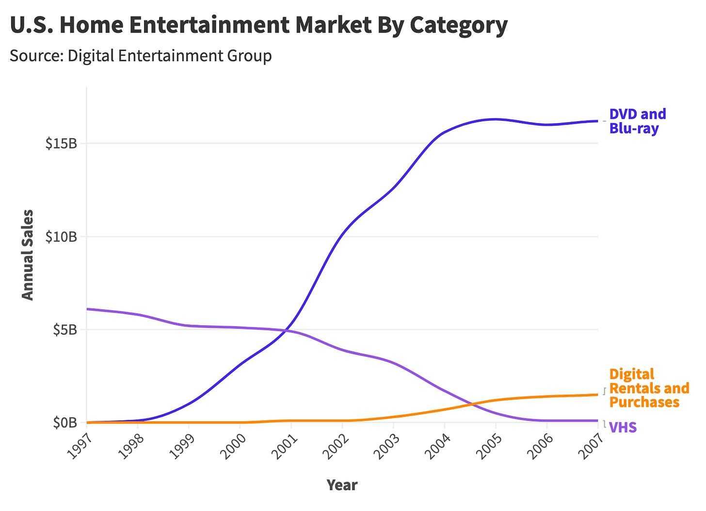 In the early 2000s, DVD sales topped $16 billion annually—tripling the size of the home video market first established by VHS.