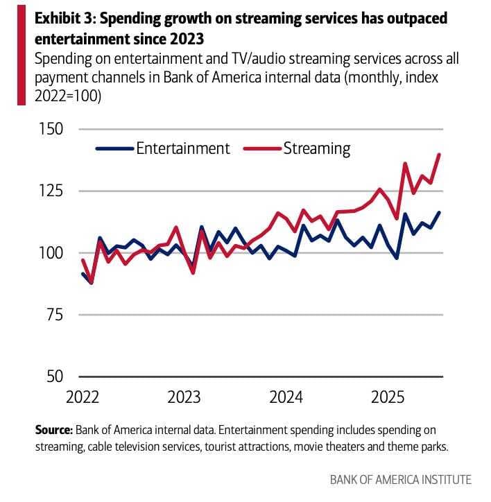 In the past four years, consumer spending on streaming platforms has surpassed combined expenditures on cable TV, movie theaters, tourist attractions, and theme parks.