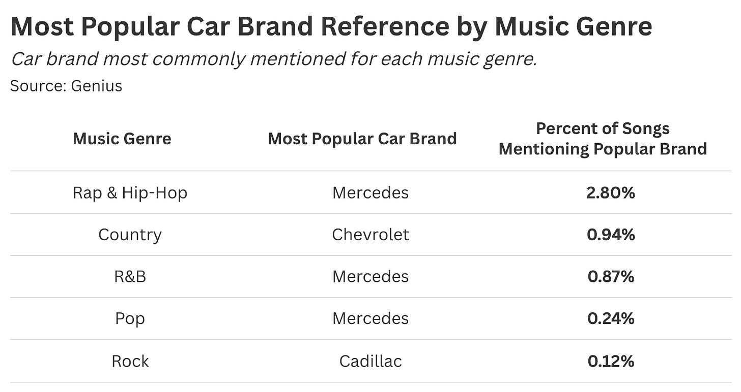 Among the five most common music formats, Mercedes is frequently mentioned in pop, rap, and R&B, Chevrolet is a fixture of country music, and Cadillac is commonly referenced in rock.