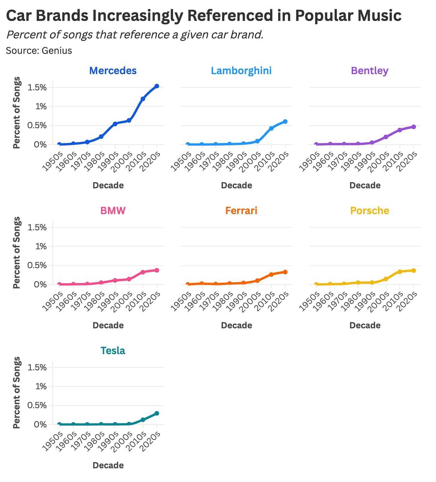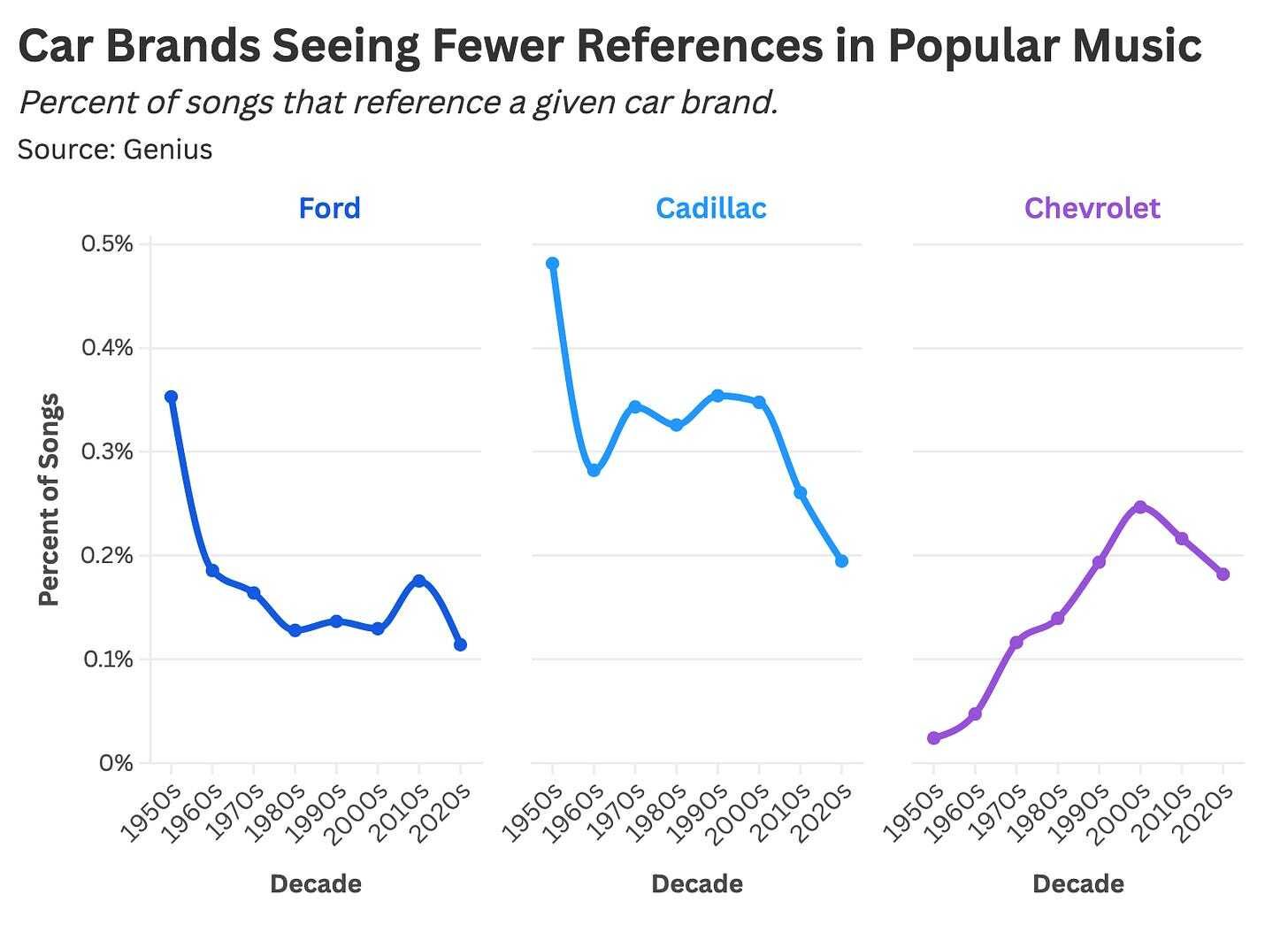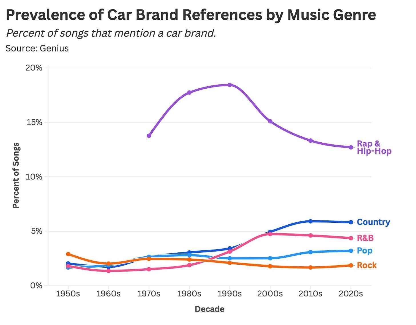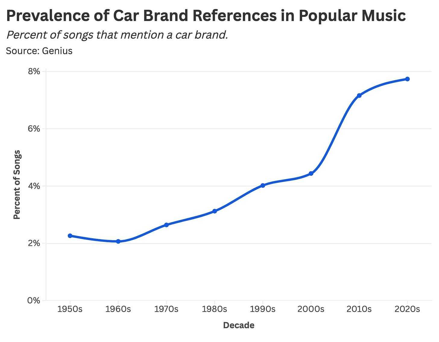 Once explicitly banned by certain radio stations, car brand mentions have become a mainstay of modern music, with references to automakers appearing in ~8% of all Billboard-charting songs.