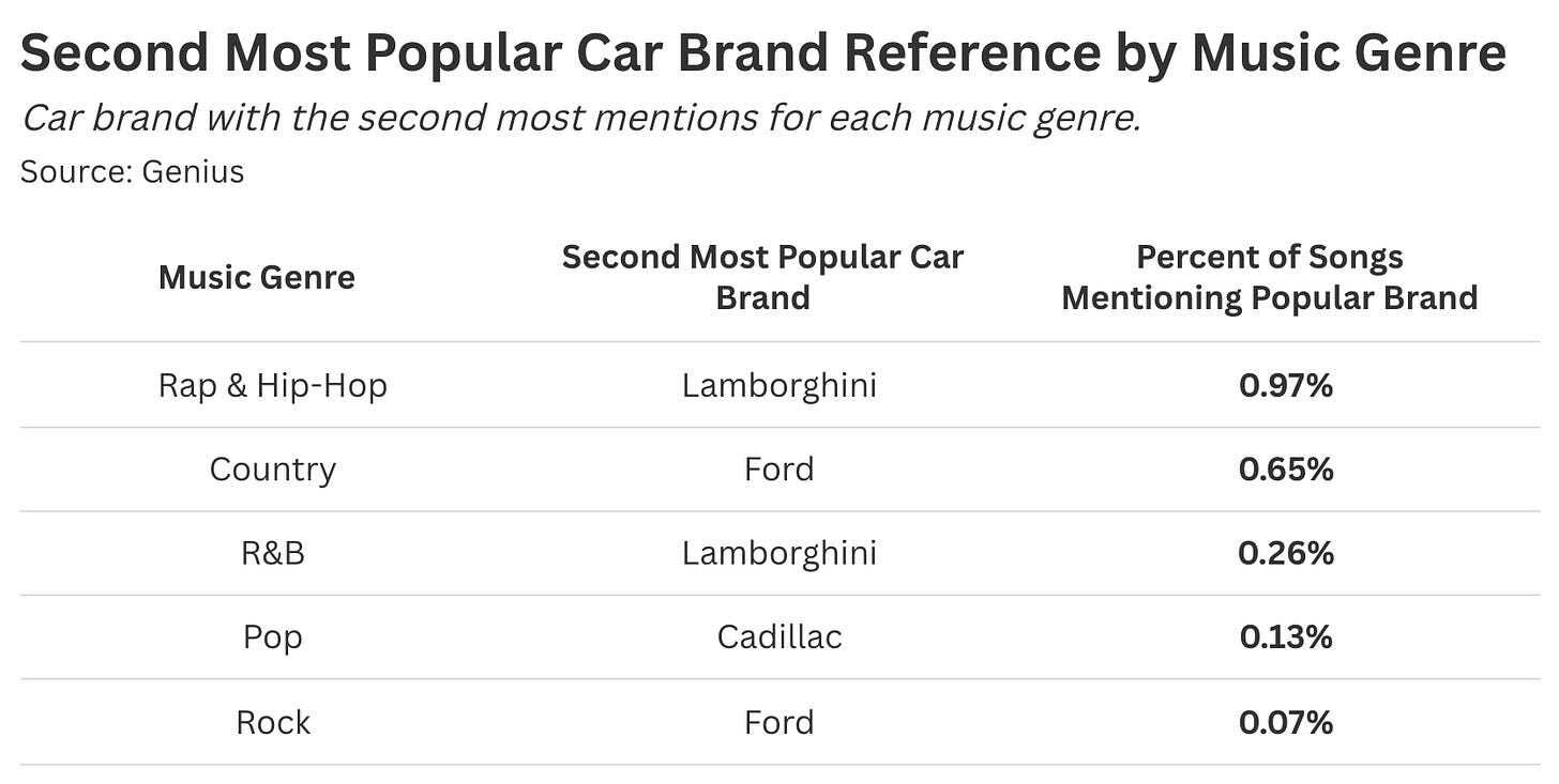 To better understand this phenomenon, I also reviewed the second most frequently mentioned brand across these genres and found that Lamborghini is heavily name-checked in rap and R&B, while Ford is a country music mainstay (particularly the Ford F-150 pickup truck).